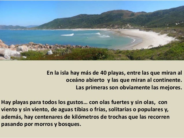 - En el norte se concentran las mejores playas y los barrios más importantes, tanto los más ricos (Jureré, Cacupé, Sambaquí, Praia Brava) como los más populares (Canasvieiras, Ingleses, Rio Vermelho). En el centro, al oeste está la capital, unida a su parte continental por el puente. Al este se encuentra el acceso a la Laguna de la Concepción y a su barrio, así como a playas muy solicitadas (Mole, Joaquina). En el sur hay playas muy bonitas (Pantano, Naufragados) pero la ocupación humana crece rápidamente (Campeche). La costa este es linda.